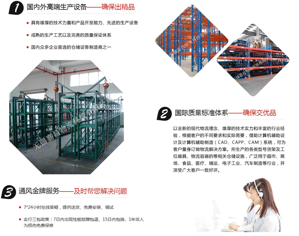 無錫嘉昌倉儲貨架有限公司擁有多年的設(shè)計、生產(chǎn)、管理經(jīng)驗。以全新的現(xiàn)代物流理念、雄厚的技術(shù)實力和豐富的行業(yè)經(jīng)驗,根據(jù)客戶的不同要求和實際需要,借助計算機(jī)輔助設(shè)計及計算機(jī)輔助制造(CAD、CAPP、CAM)系統(tǒng),可為客戶量身訂做物流解決方案。所生產(chǎn)的各類型號貨架及工位器具、物流容器的等相關(guān)倉儲設(shè)施,廣泛用于超市、商場、食品、醫(yī)療、儲運(yùn)、電子工業(yè)、汽車制造等行業(yè),并深受廣大客戶一致好評。